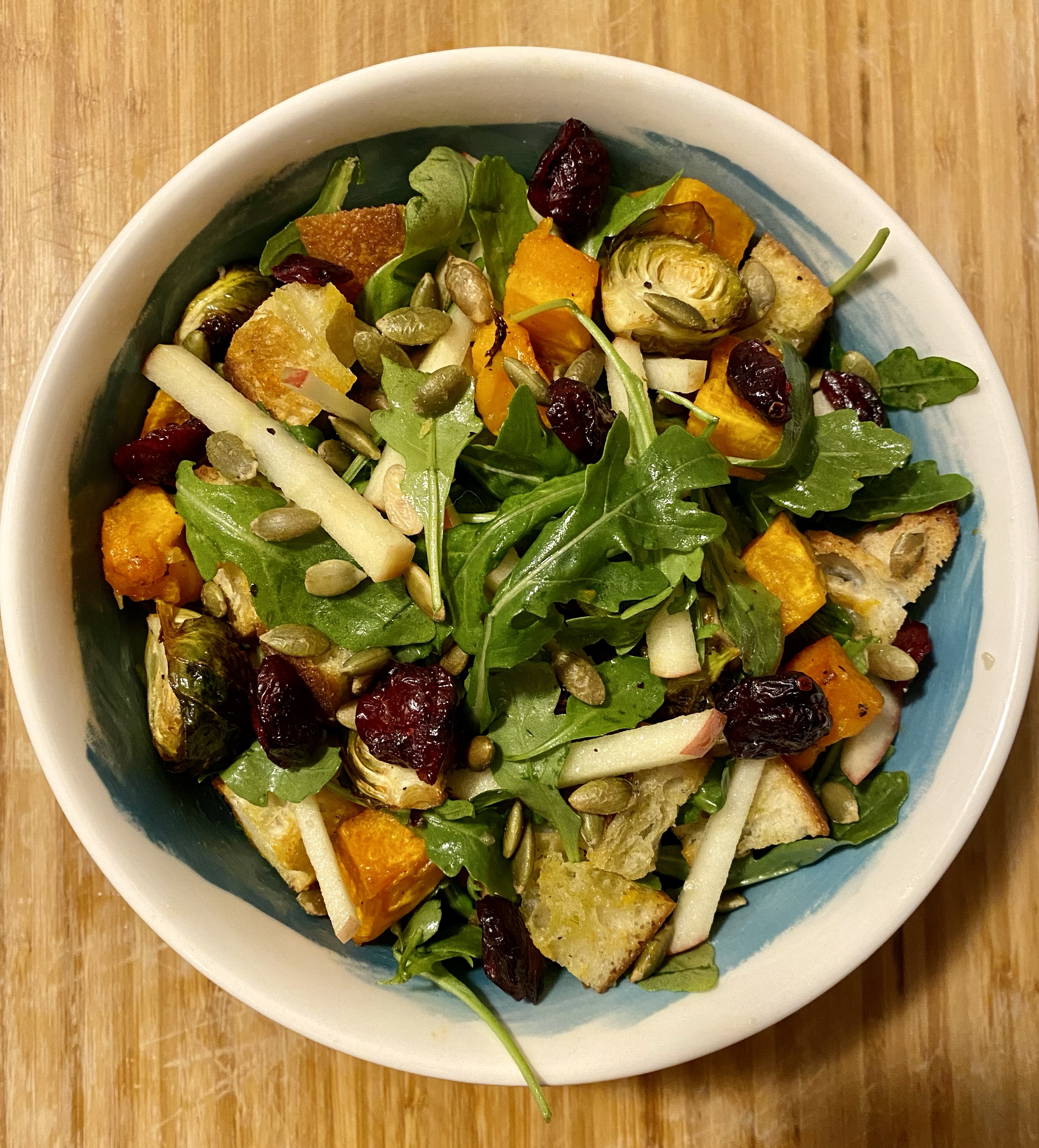 The simplicity of panzanella- an italian chopped salad with soaked stale bread- makes it very versatile and a guaranteed hit. I customized mine by using blue sweet and salty danish blue cheese, dried fruit, butternut squash and sourdough bread. This beautiful autumn salad is filling, nutritious, and easily customizable to your taste. You can even add plant based sausage, or winter beans for more protein.