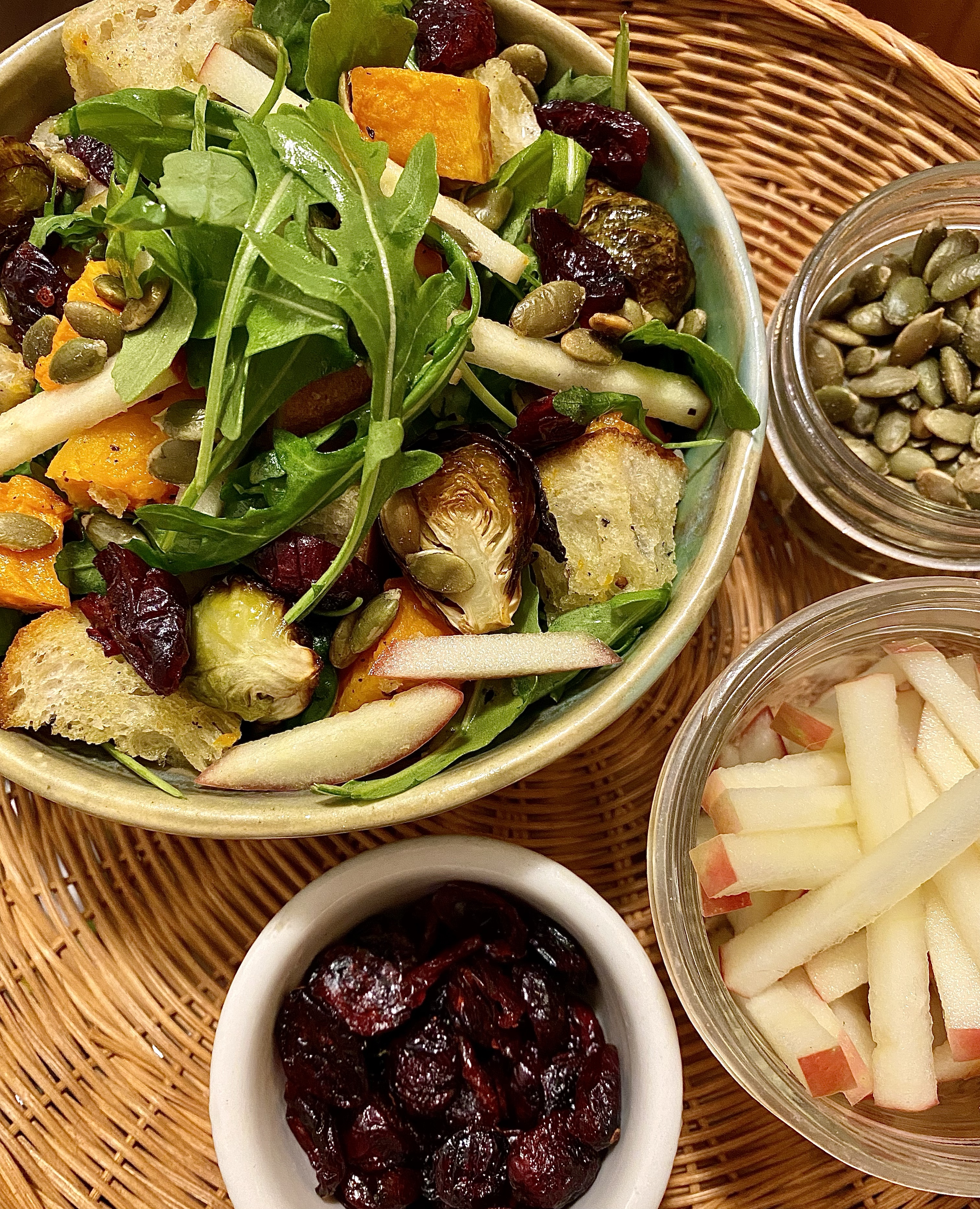 4. In a large bowl, combine the bread, roasted veg, apple, dried cranberries and pepitas.